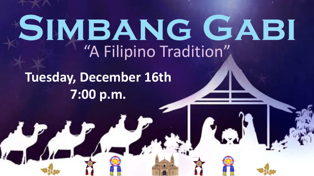 The Diocese of Orlando’s Filipino Ministry celebrates “Simbang Gabi,” a novena of Masses and gatherings in preparation for Christmas. Come and participate this Tuesday here at St. Isaac Jogues. The event showcases Filipino spirituality and culture. Everyone is invited. After Mass, will be a meal featuring delicious Filipino dishes.